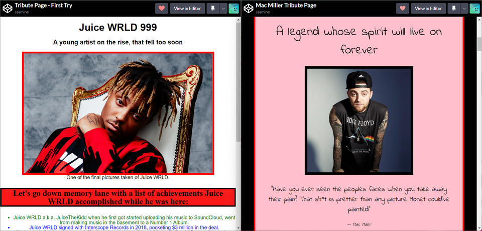 Here you'll compare two tribute pages I created on codepen.io. The page on the left, I created as my first ever coding project. The one on the right, is my second attempt at a tribute page after receiving my Responsive Web Design Certificate. You'll notice the improvement to the right page compared to the left. To check out these two tribute pages, visit these links here: https://codepen.io/Cloud999/pen/ExvWaYY