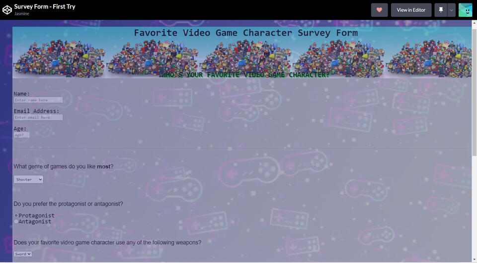 Before receiving my Responsive Web Design Certificate, I had to create a survey form using HTML5 and CSS. What you see here is my first attempt at this project. I chose to do a survey form on Favorite Video Game Character. This subject speaks to me personally because I love video games. I found it interesting to receive statistics on the general public's opinion about which video game character is there favorite. To view this project on codepen.io check out this link: https://codepen.io/Cloud_999/pen/dyzQdpy