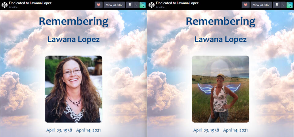 This project was a personal project I created in dedication to Lawana Lopez, a dear friend of mine. I met Lawana in Alaska, when I went there for a summer job in 2017. Lawana was a motherly figure to all, and always brought good energy wherever she went. This project previews a photo of Lawana without angel wings, and after hovering over her photo, it will reveal her with angel wings. To see this effect in action, visit this link: https://codepen.io/Cloud_999/pen/wvyYVxY
