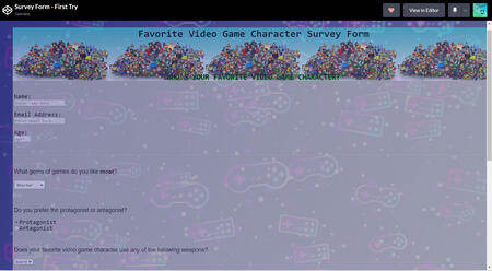 Before receiving my Responsive Web Design Certificate, I had to create a survey form using HTML5 and CSS. What you see here is my first attempt at this project. I chose to do a survey form on Favorite Video Game Character. This subject speaks to me personally because I love video games. I found it interesting to receive statistics on the general public's opinion about which video game character is there favorite. To view this project on codepen.io check out this link: https://codepen.io/Cloud_999/pen/dyzQdpy